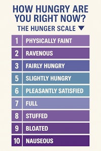 Aim to stay in the Blue Zone: between Slightly Hungry and Pleasantly Satisfied. This keeps your body fueled, reduces stress, and helps maintain natural balance.